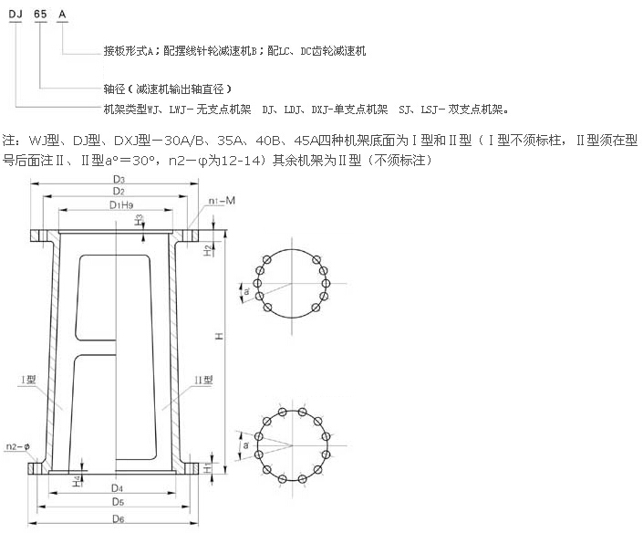 本系列機架可與各種立式擺線針輪減速機相配,可配套選用各種聯軸器,若與齒輪減速機配套,連接尺寸由本公司自選調整,為安裝雙端面機械密封,配備LWJ、LDJ、LSJ等增高型,除LWJ的H值和LDJ、LSJ的H及H2值增大以外,其余尺寸均未變動。