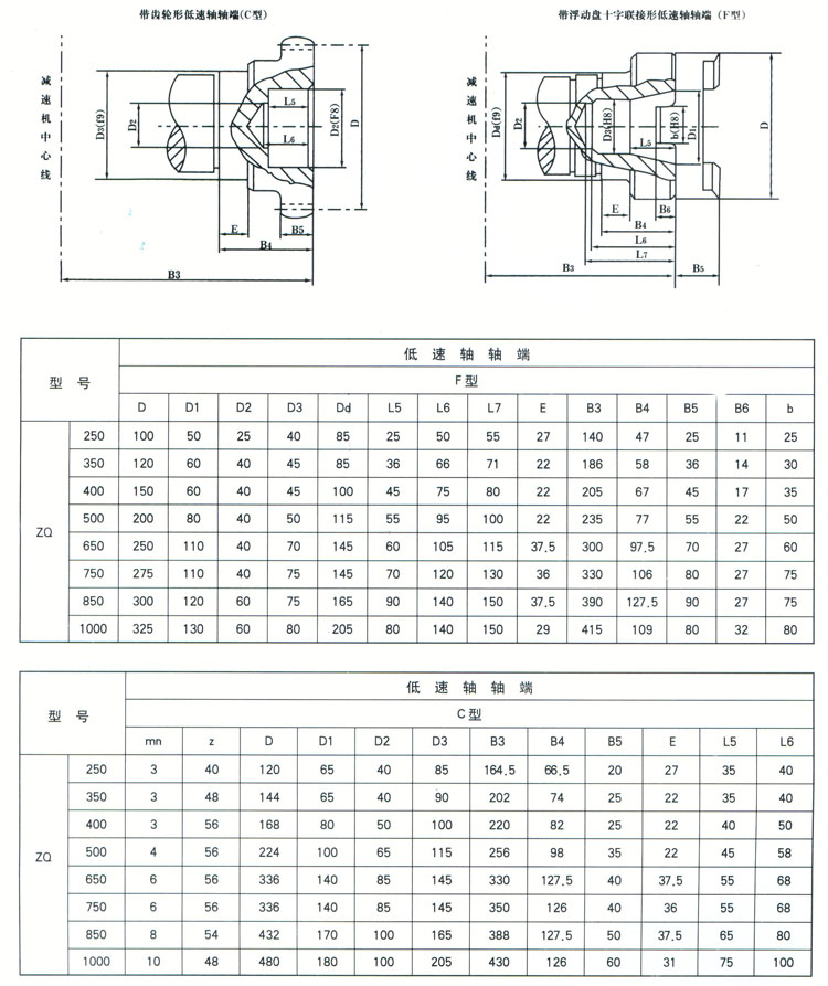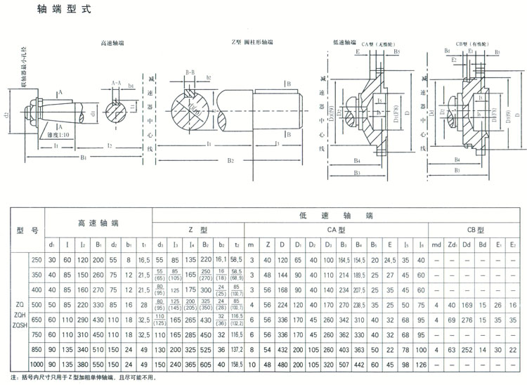 ZQ(JZQ),ZQH三種出軸形式有:圓柱型軸端,F為十字塊軸端,C CA為齒形軸端