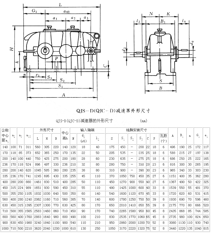1)結(jié)構(gòu)型式  QJ-D型減速器分為:QJR-D(QJB-D)型為二級(jí),QJS-D(QJC-D)型為三級(jí)。QJRS-D(QJD-D)型為二級(jí)安裝尺寸三級(jí)速比。