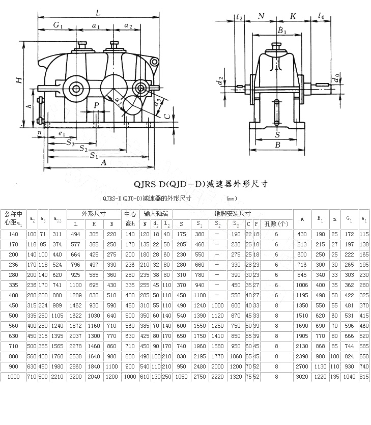 1)結(jié)構(gòu)型式 QJ-D型減速器分為:QJR-D(QJB-D)型為二級,QJS-D(QJC-D)型為三級。QJRS-D(QJD-D)型為二級安裝尺寸三級速比。